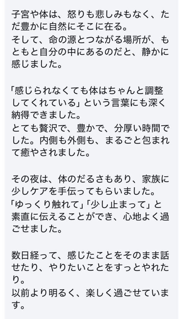 やっと子宮や卵巣に向き合う機会を与えられたものの、それでも、これ以上何かが噴き出してきたら怖かった時期もありましたので、先日、子宮セラピーを受けてくださった方の受ける前のそのお氣持ちもすごくよくわかるなぁと…